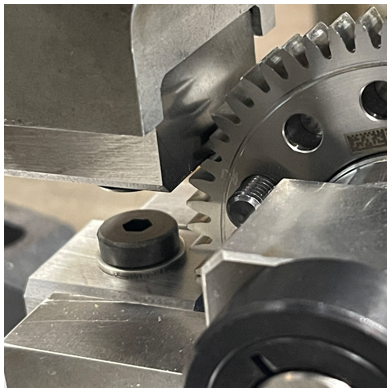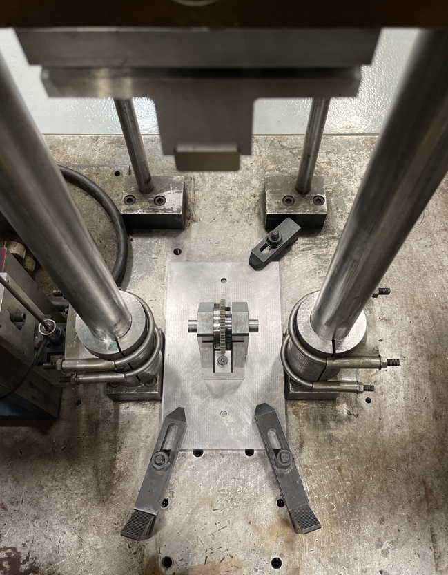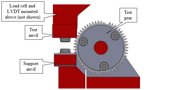 Figure 2: Production gear mounted in test fixture with impact test anvil resting at the point of contact