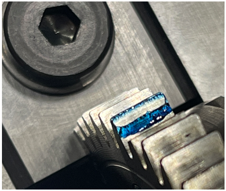 Figure 3: Test tooth with layout bluing applied, after gentle contact and removal of test anvil