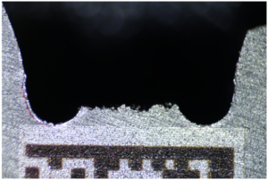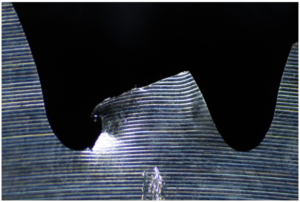 Upon completion of hardware setup, searching tests are performed starting at a low drop height (a few inches in this case) and progressively increasing in height. Tooth fracture surfaces are examined to ensure that the failure did not originate at the edge of the tooth. The aim is to have failures be a reflection of the material strength and not influenced by other factors (edge break or lack thereof, poor load application alignment, etc.). In this project, there was a clear difference in the failure characteristics of each material. For a given hardness, brittle materials tend to perform worse than ductile materials at high strain rates. Typical crack paths for each type are shown in Figure 4. Can you guess which one is PM?
