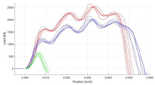 The load versus position data for several repetitions of each group is presented in Figure 5. While there is some ringing in two of the three groups, clear strength differences exist. Comparisons are typically made using the first reduction in load (yield point), maximum load, and energy absorbed to both yield and max load.